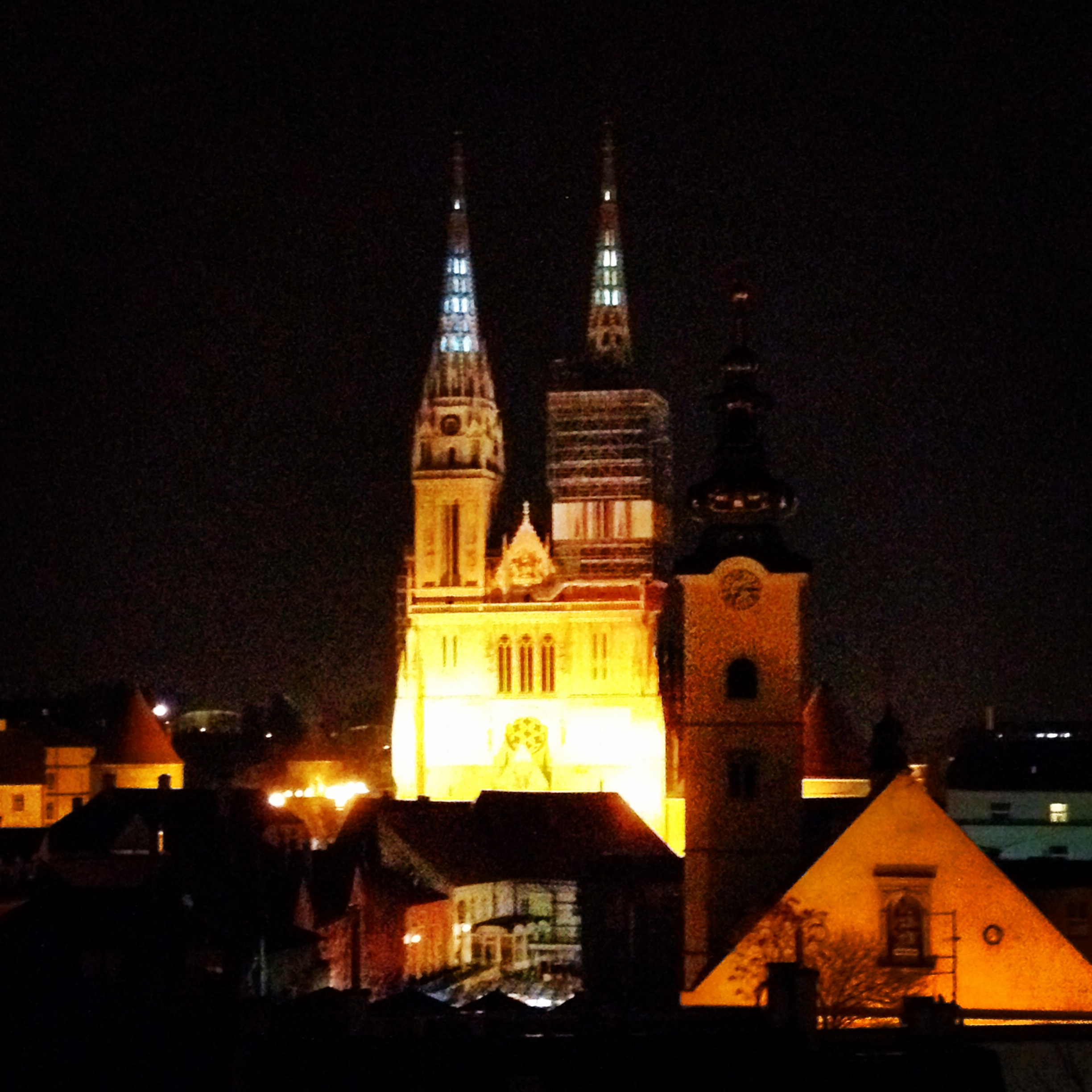 Because I am still not great about traveling by myself (that is, being in a foreign place alone, as opposed to getting there alone), I wimped out and couldn’t bring myself to go to a restaurant alone. I still haven’t done that even in Paris where it would be pretty normal. Instead, I found a place that made good salads for takeout, bought some Karlovačko beer and other snacks from the Konzum grocery store, and headed back to my hotel room for the rest of the night, which I spent being amused at trying to decipher Croatian coverage of Olympic curling. (Most non-Croatian language channels were in German, so there weren’t a whole lot of options either way.) Before I went to bed, I snapped this great picture of the illuminated cathedral behind the square: